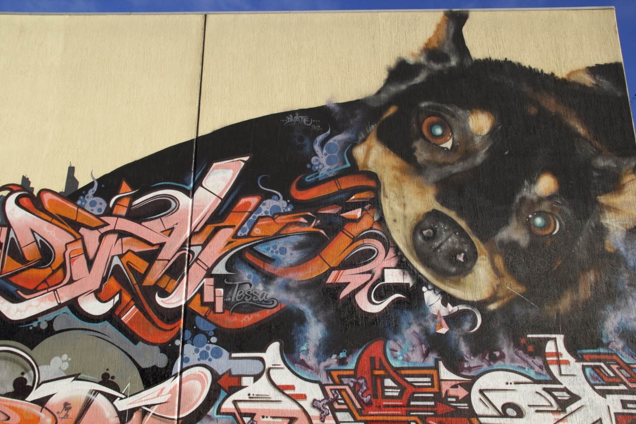 I went hunting yesterday. Graffiti hunting. What this means is that I put on my cold weather gear (hoodie AND jacket) and started walking in the direction of a neighborhood in the process of being gentrified. I discovered there are a few varieties of street art – spray paint, stickers, and posters. Here’s some of what I found.