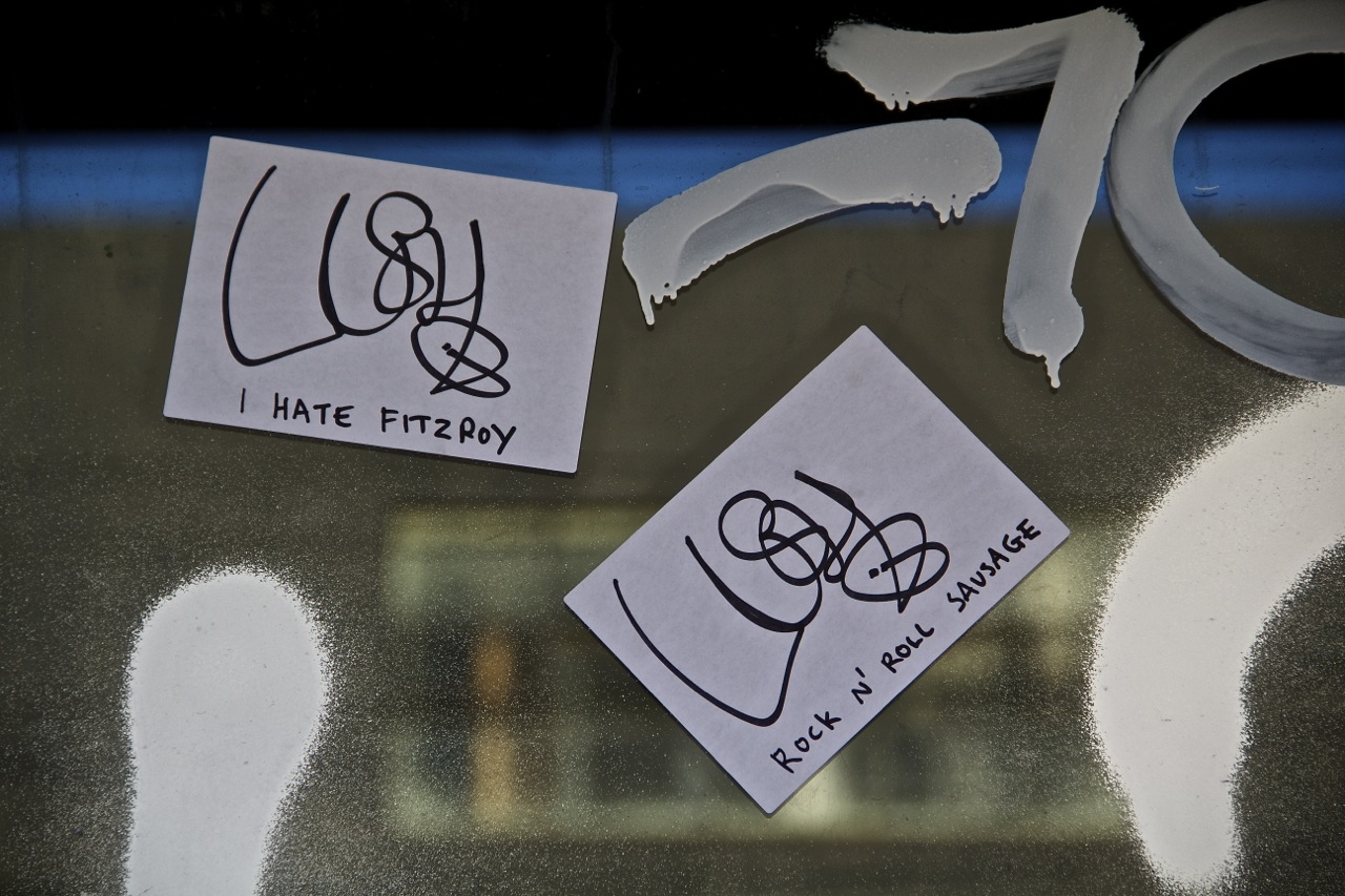 Fitzroy is a neighborhood in Melbourne. “Rock n’ Roll Sausage” was one of many nonsensical messages that were printed on the stickers on this window.