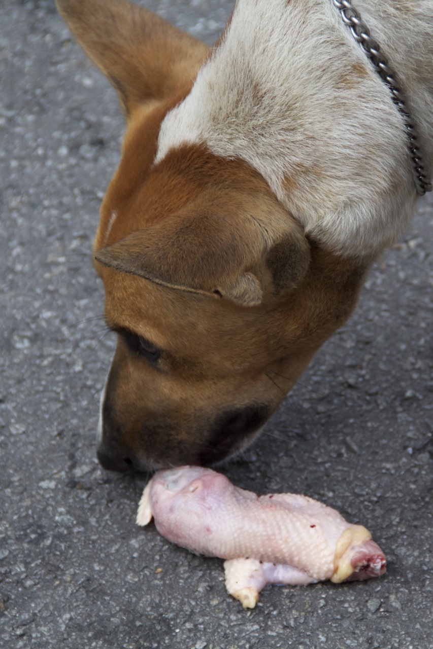 Somehow this dog got a hold of a chicken head. Something strangely ironic or possibly sadistic about watching a dog eat the head of another animal.